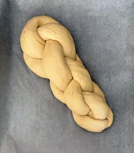Riporre la treccia su una pirofila rivestita con carta da forno e coprirla per la seconda lievitazione.