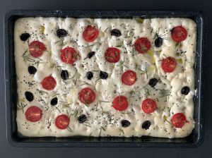 Focaccia con Pomodorini, Olive Nere, Rosmarino e Sale Nero delle Hawaii